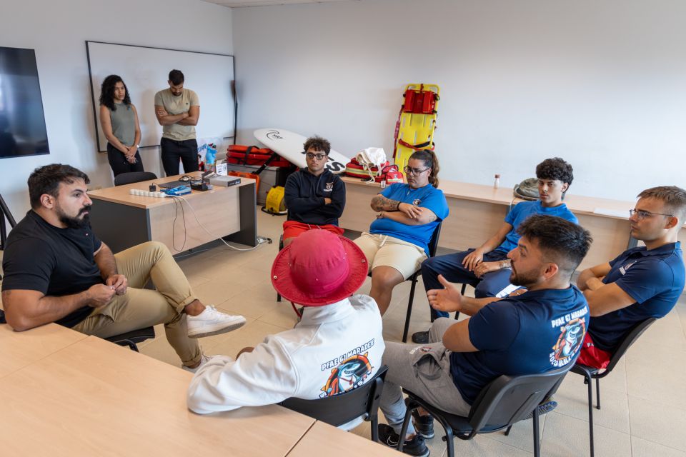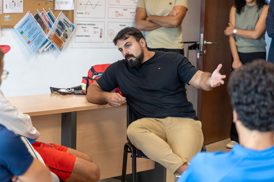 Rescue swimmer Eduardo Blasco, with many years of experience saving lives at sea, took part in a meeting with students from the Youth Guarantee Training and Employment Programme (PFAE GJ) Maradeje. During the session, he addressed the present and future of lifeguard services, as well as lessons learned throughout his career. (Rescue swimmers are usually called in when conditions are dangerous or beyond standard lifeguard intervention.)